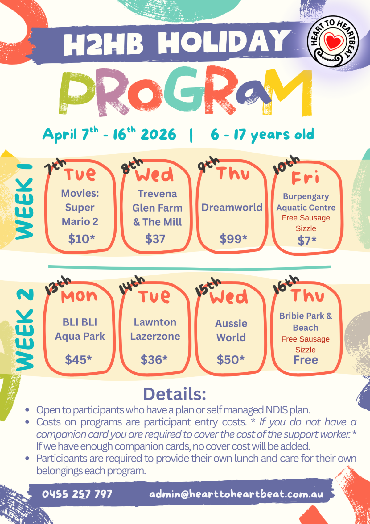 Heart to Heartbeat’s April Holiday Program offers a fun and supportive school holiday experience for children and young people aged 6–17 years. The program includes a variety of engaging community outings and activities designed to encourage social interaction, confidence building, and positive participation in the community.