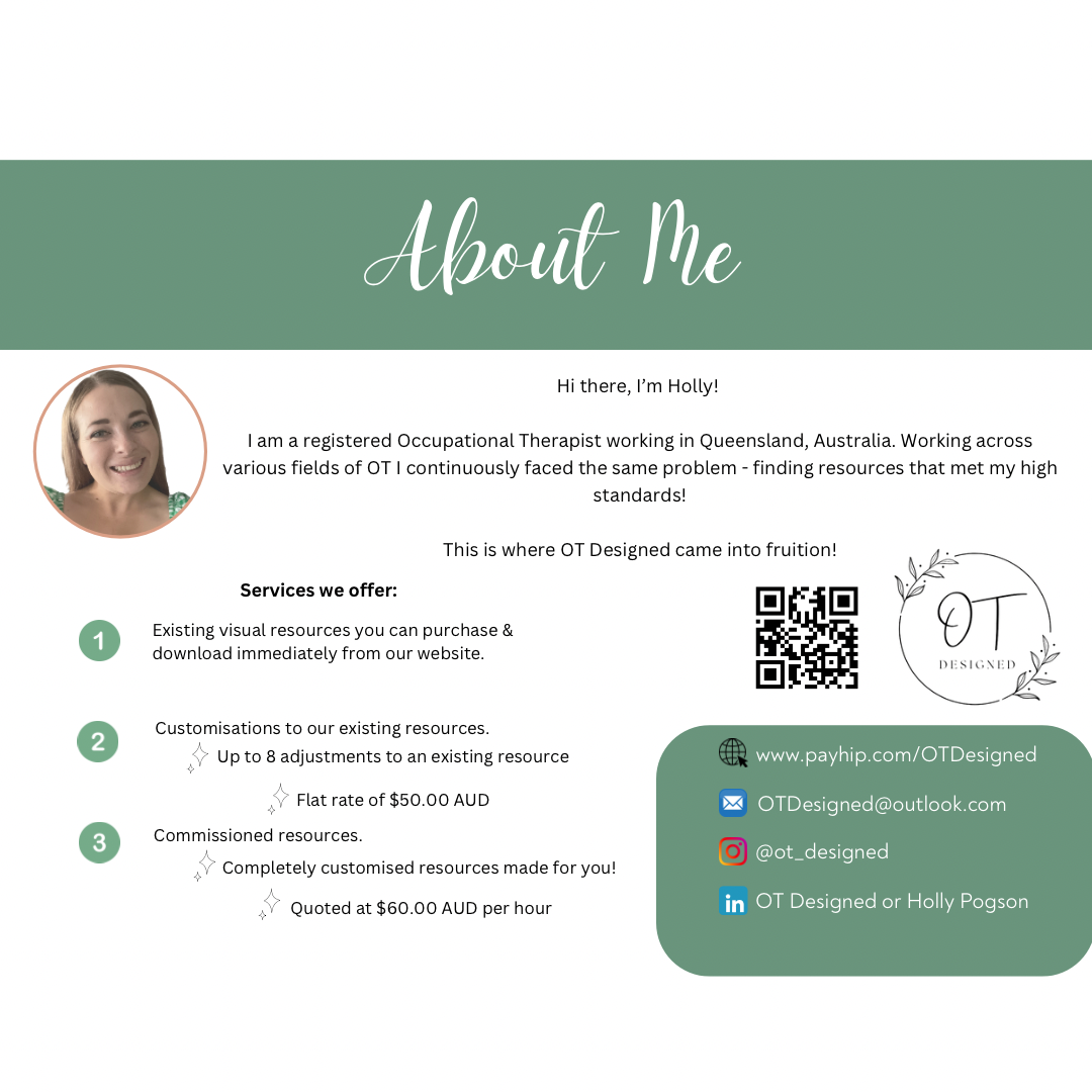 At OT Designed you can find pre-made resources or request custom resources, individualised just for you and your needs!