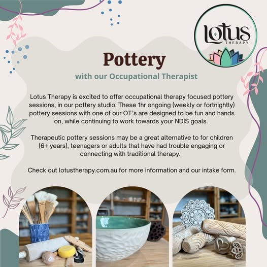Lotus Therapy is excited to offer occupational therapy focused pottery sessions, in our pottery studio. These 1hr ongoing (weekly or fortnightly) pottery sessions with one of our OT’s are designed to be fun and hands on, while continuing to work towards your NDIS goals. Sessions include all the clay, material and tools, glazing and firing of your creations.