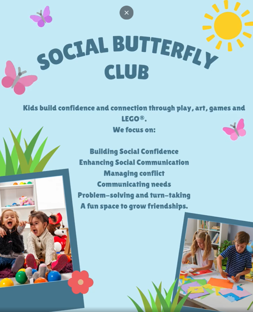 Our Social Butterfly Club is the perfect program for kids aged 6–12: a Social Confidence and Skills building program facilitated by our Play Therapist, Counsellor & Educational Therapist (Lauren) and supported by our enthusiastic assistant facilitators (Marianne & Maya).
