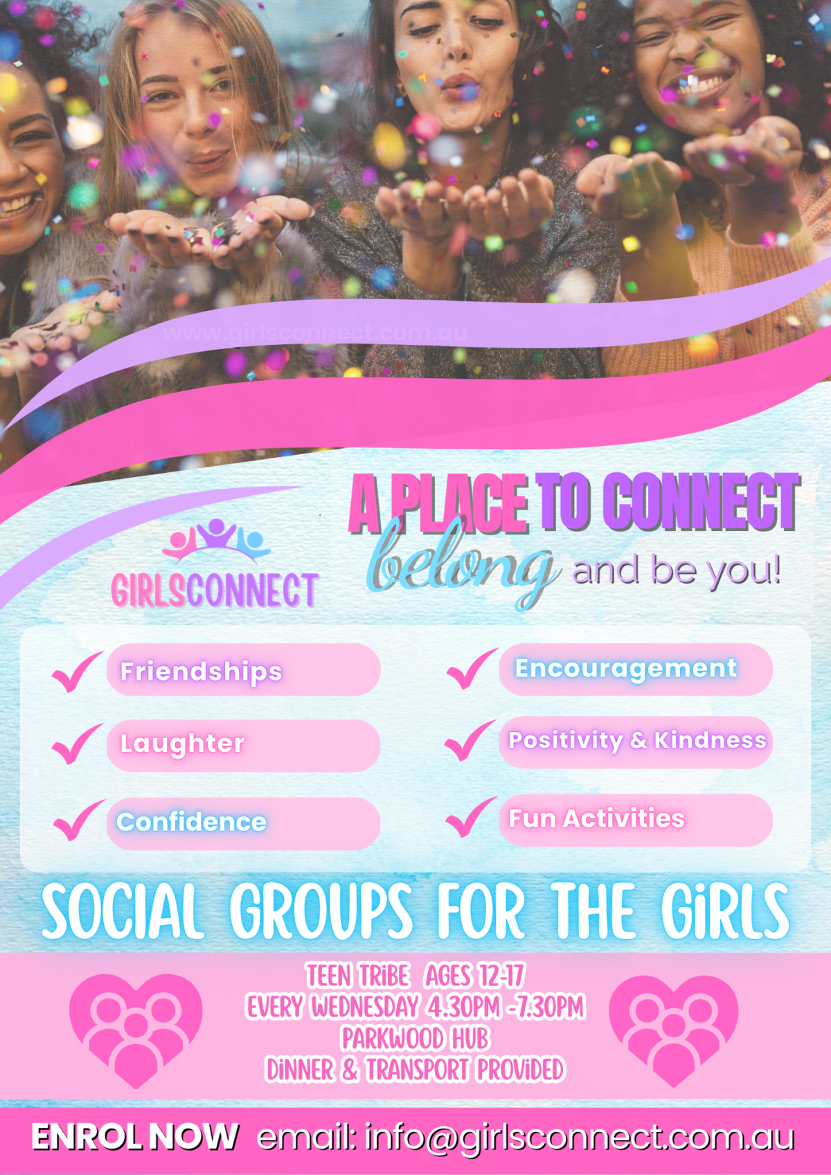 Teen Tribe is a weekly social group designed especially for teenage girls aged 12–17 who are looking to build friendships, confidence and feel a sense of belonging.